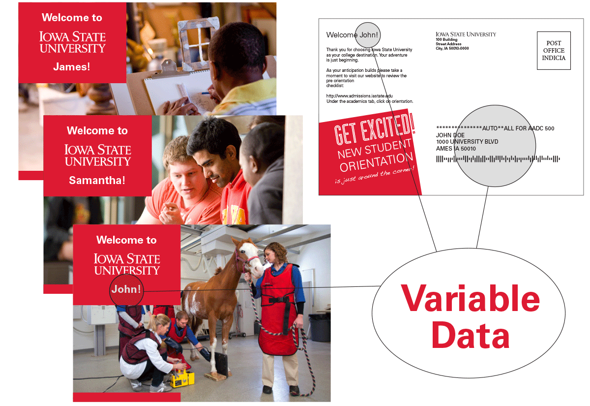 Variable Data Printing is performed with digital printing equipment. An excel file, provided by the customer, contains the variable data in each column that is used to personalize each printed piece. Then special software extracts this data from the excel file and merges it with design to create the